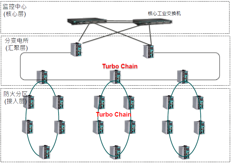 管廊里交換機(jī)與控制室的機(jī)架式交換機(jī)組成冗余環(huán)網(wǎng),來保證網(wǎng)絡(luò)通信的冗余性。交換機(jī)每200米布置一臺(tái),每臺(tái)交換機(jī)上連接高清IP Camera來對(duì)管廊內(nèi)部做視頻監(jiān)控。