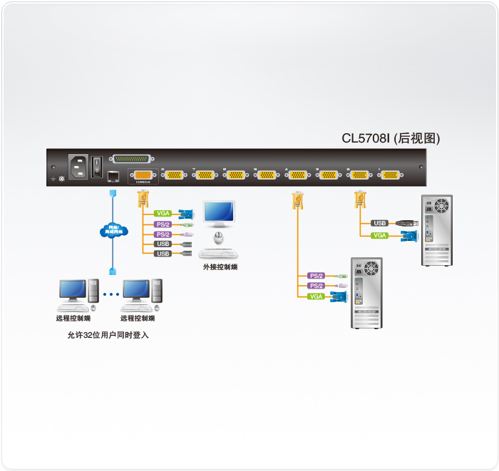 8端口PS/2-USB VGA LCD KVM over IP切換器 支持菊式串接以及USB外圍設(shè)備連接端口功能