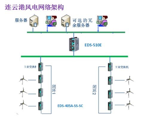 每個(gè)風(fēng)機(jī)內(nèi)放置一臺(tái)交換機(jī)(EDS-408A-SS-SC),用光口組環(huán),電口接監(jiān)控?cái)z像機(jī)。所有風(fēng)機(jī)組成兩個(gè)環(huán),兩個(gè)環(huán)網(wǎng)連接一臺(tái)匯聚交換機(jī)(EDS-510E)上面?zhèn)鹘o監(jiān)控中心。在每臺(tái)風(fēng)機(jī)內(nèi)部配一臺(tái)EDS-408A-SS-SC,因?yàn)槠鋱?jiān)固的設(shè)計(jì),可靠的工業(yè)品質(zhì)以及MOXA特有的Turbo Ring技術(shù),可以實(shí)現(xiàn)工業(yè)上冗余備份,快速恢復(fù),從而保證系統(tǒng)通信安全。在匯聚端采用的是MOXA EDS-510E交換機(jī),其既有千兆combo口,又有百兆電口,千兆口可以向上級(jí)聯(lián),從而保證下面的視頻數(shù)據(jù)不會(huì)存在延遲。百兆口還可以接入一些其他設(shè)備。MOXA交換機(jī)環(huán)網(wǎng)技術(shù)Turbo Ring,性能穩(wěn)定,恢復(fù)時(shí)間快(20ms以內(nèi))。