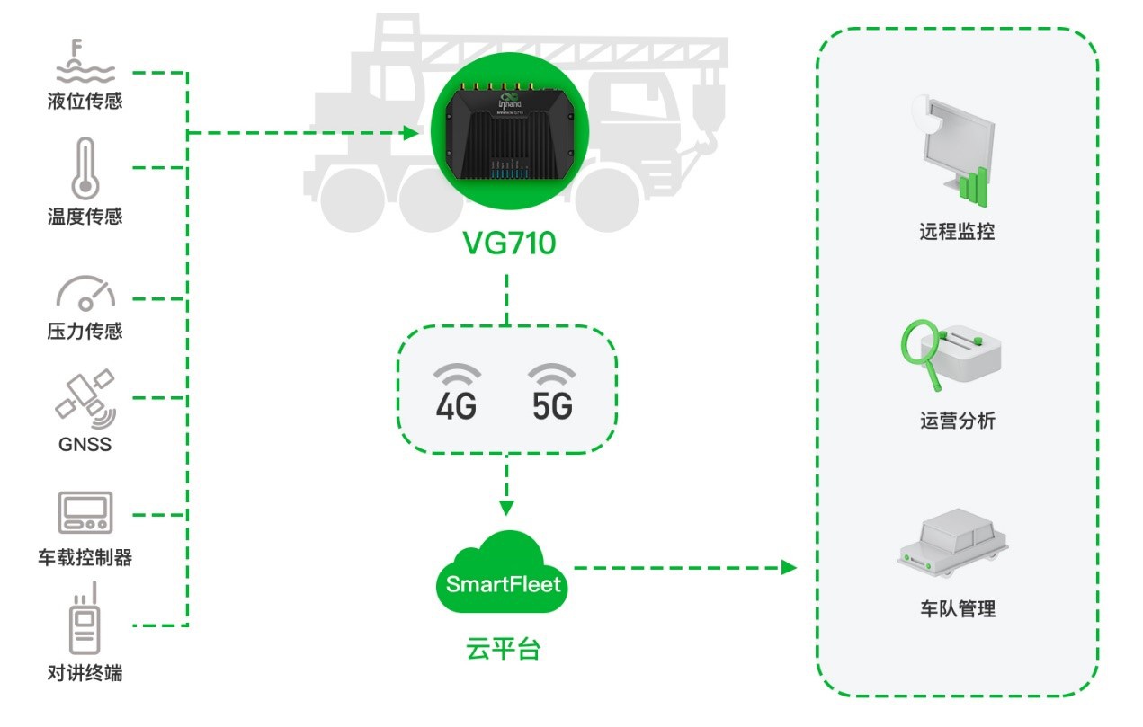 在工程車輛部署VG710車載網(wǎng)關(guān),車載網(wǎng)關(guān)提供豐富的通信接口將車載設(shè)備聯(lián)網(wǎng),并實(shí)時(shí)監(jiān)控工程車輛和工程裝備工作狀態(tài),監(jiān)控各類傳感數(shù)據(jù),不間斷定位車輛位置,通過邊緣計(jì)算將各類數(shù)據(jù)處理并上傳至SmartFleet車輛管理云平臺(tái)。